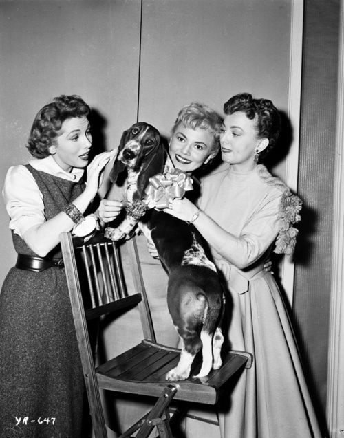 “Cleo, the ‘talking’ basset hound on Jackie’Cooper’s NBC-TV program, ‘The People’s Choice,’ is primped for her ‘pawtograph party’ at the Los Angeles Kennel Club… by actresses Elaine Edwards, Lori Mitchell and Elaine Riley.