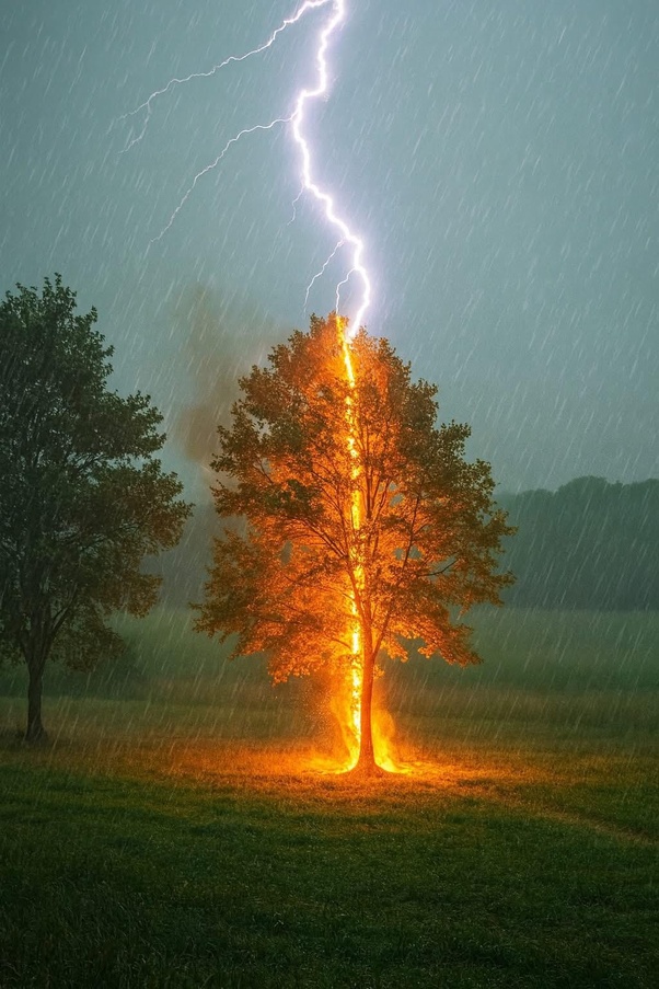 It might be done with a light sensor triggering the shutter tor a timed exposure, but actually getting it when the tree is hit would be a real stroke of luck.