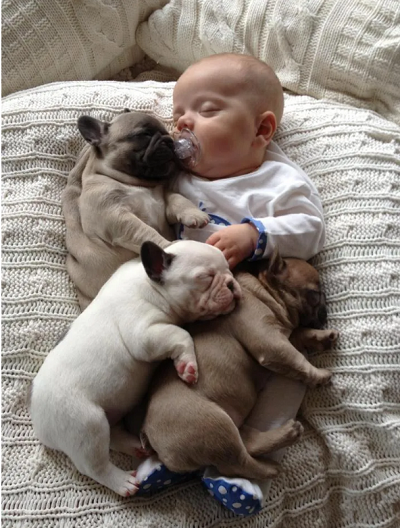 Baby Austin with his three bulldog friends