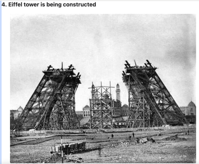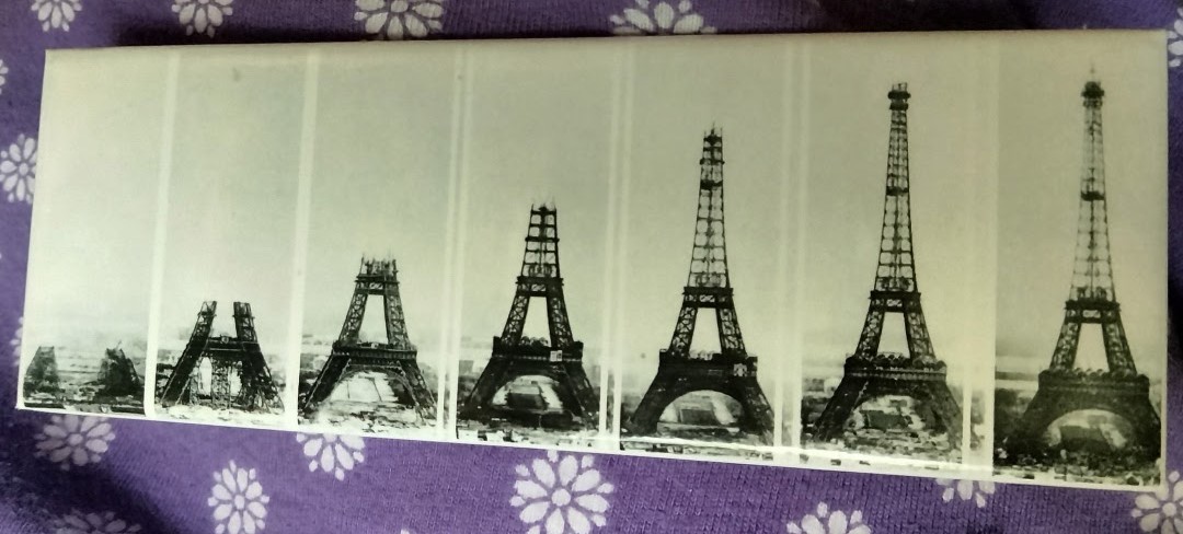 It’s about an inch and a half tall and 5″ wide, and is printed with 5 sequential photos of the Eiffel tower being built. This must be one of the ones taken at the same time. Hard to tell with 1 inch tall photos… but I’d say it’s in between the first two on my magnet.