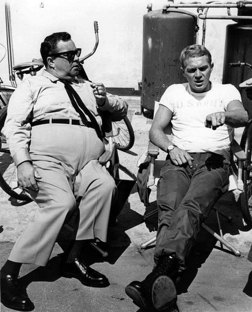 Jackie Gleason and Steve McQueen on the set of “Soldier in the Rain” from 1969.