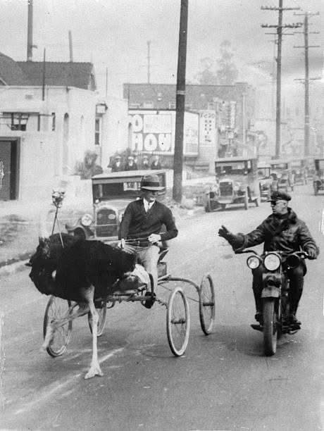 An ostrich carriage being stopped by the police for crossing the speed limit, Los Angeles, ca 1930’s.