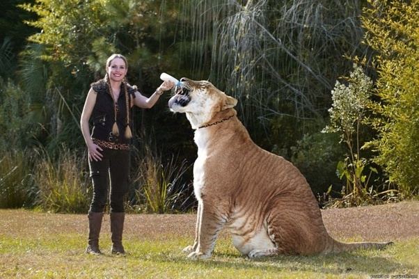 In captivity, which is the only place they exist, ligers can grow to double the size of their parents and weigh 100 times more than the average pet cat.