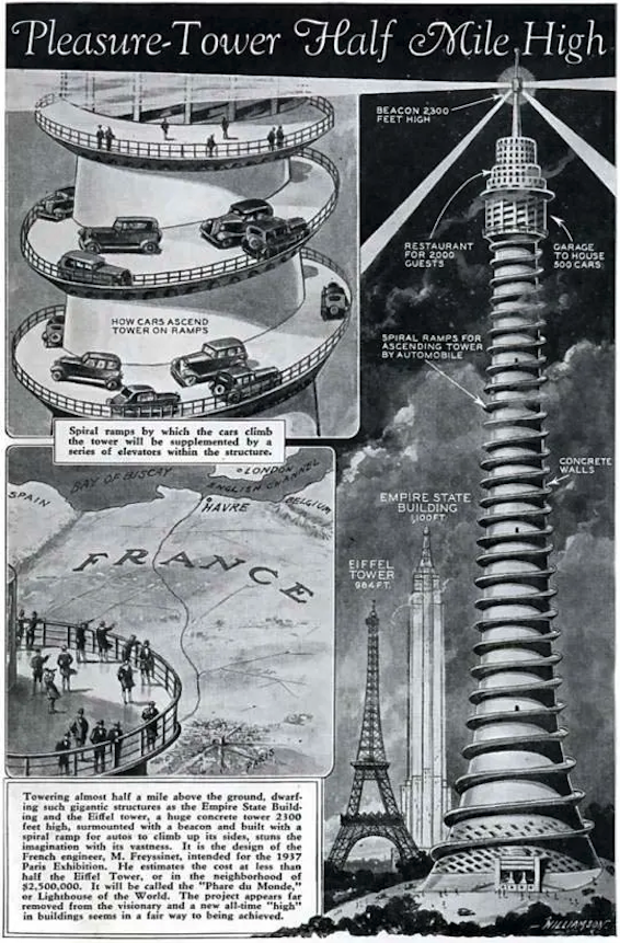 It was to be about half a mile high to the top of the beacon. The garage was going to be about 2/3 of the way up. But that means the spiralling road would still be several miles long.