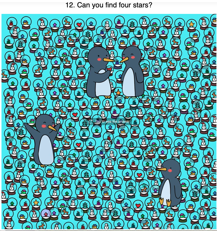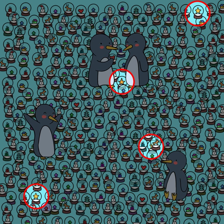 Look at the bottom right penguin…. Go to the tip of his beak, then up two globes, slightly leftward, to one with a reindeer.