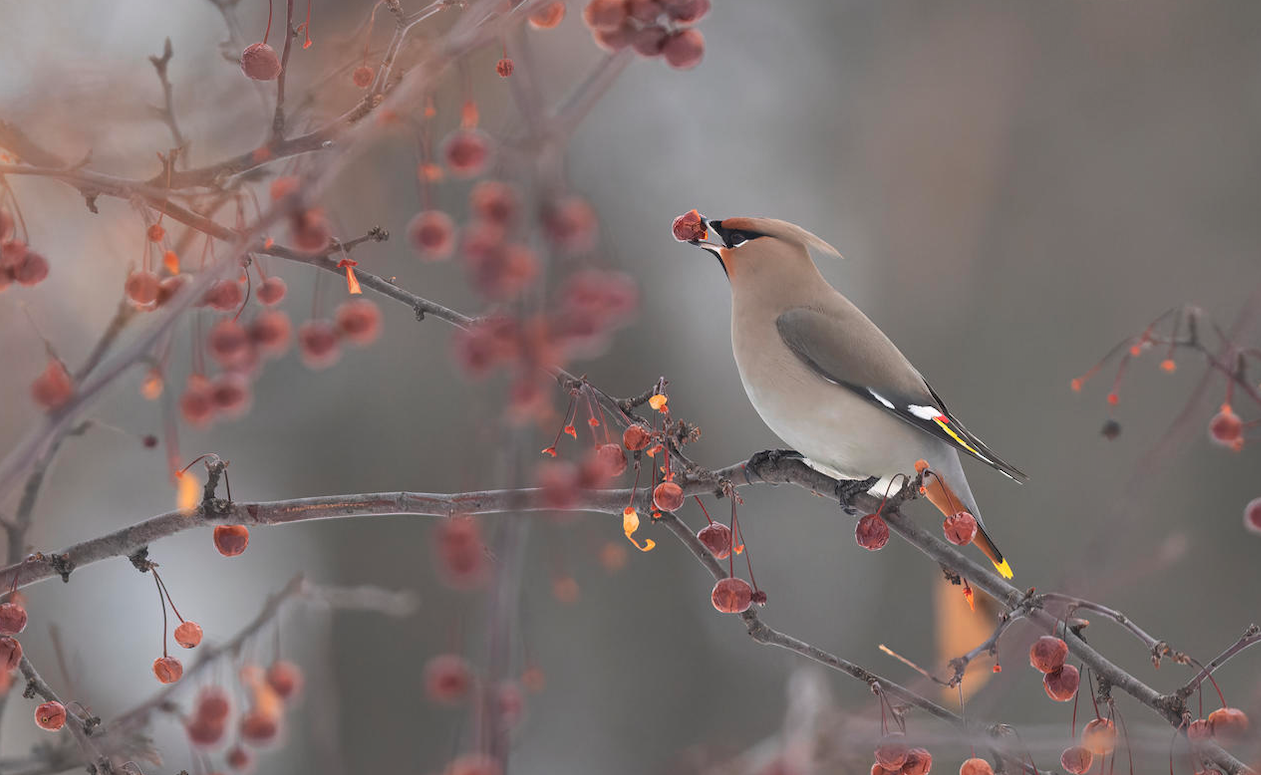 The lovely bohemian waxwing. We have he slightly drabber cedar waxwings here.