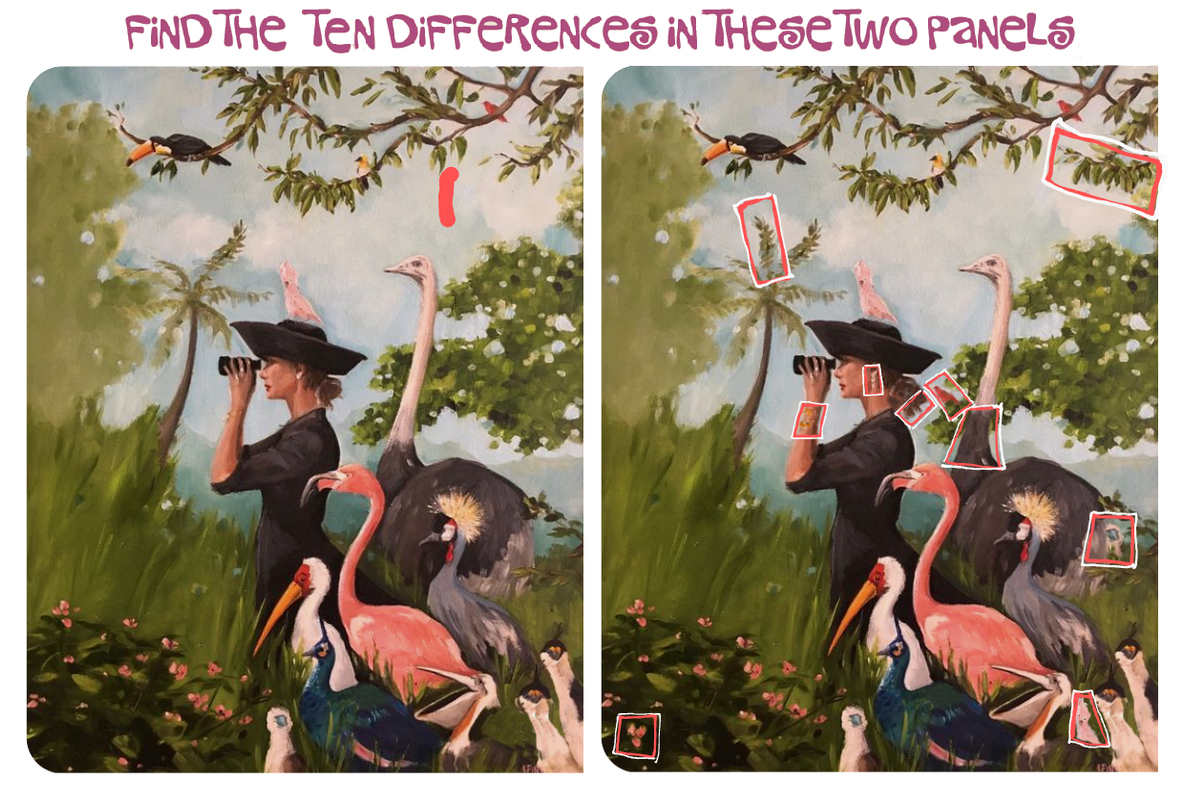 We can’t see the object of her focus… but we can focus on the TEN things that don’t match between the panels.