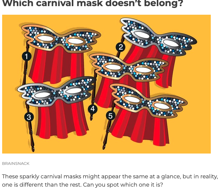 Answer: Mask number three doesn’t belong. On all the other masks, the pointed side of the eyes aims outward.