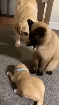 Looks like a new puppy introduction, older dog is a bit unsure, and the cat claims the puppy as its own!