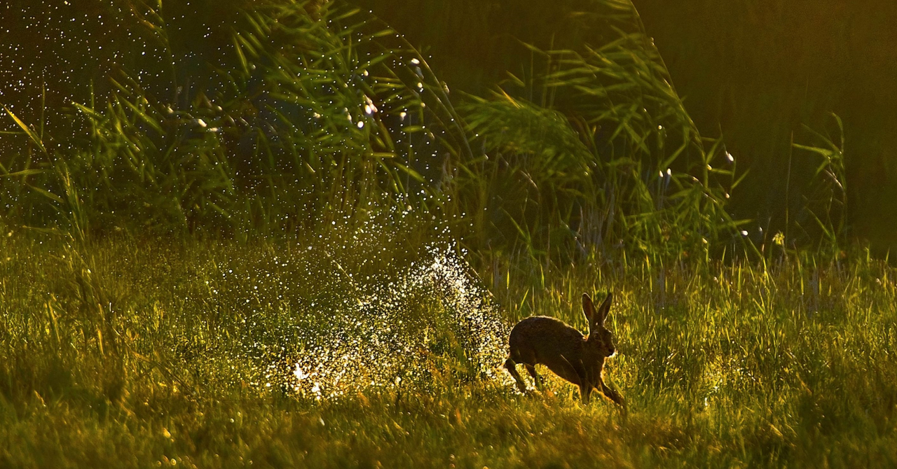 European Hare jumping through a wetland in the Netherlands
