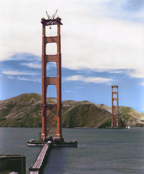 It’s 1934, before the cables were strong and the roadway hung from them. The bridge won’t open for about another three years.