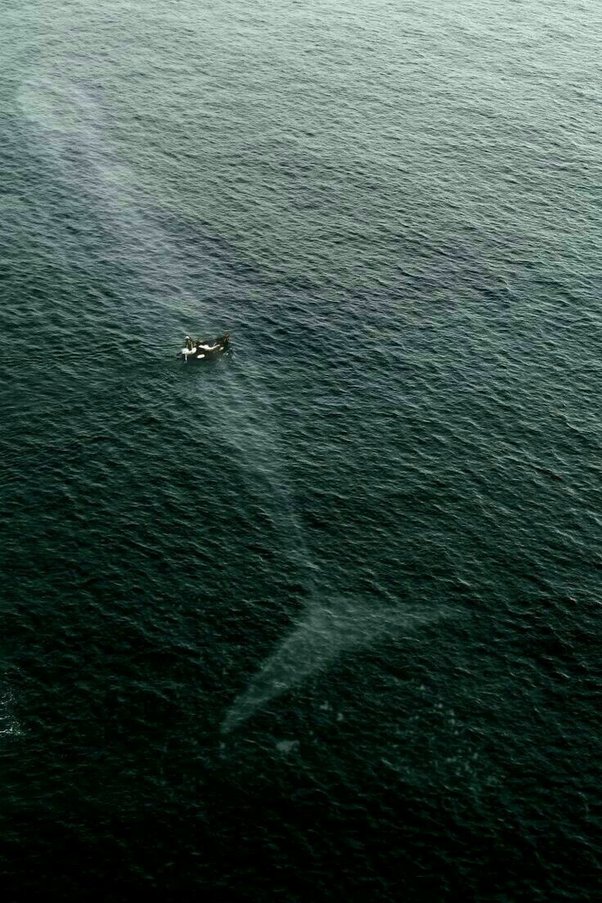 A blue whale below a boat… possibly further below than it looks, cos the water is clear.