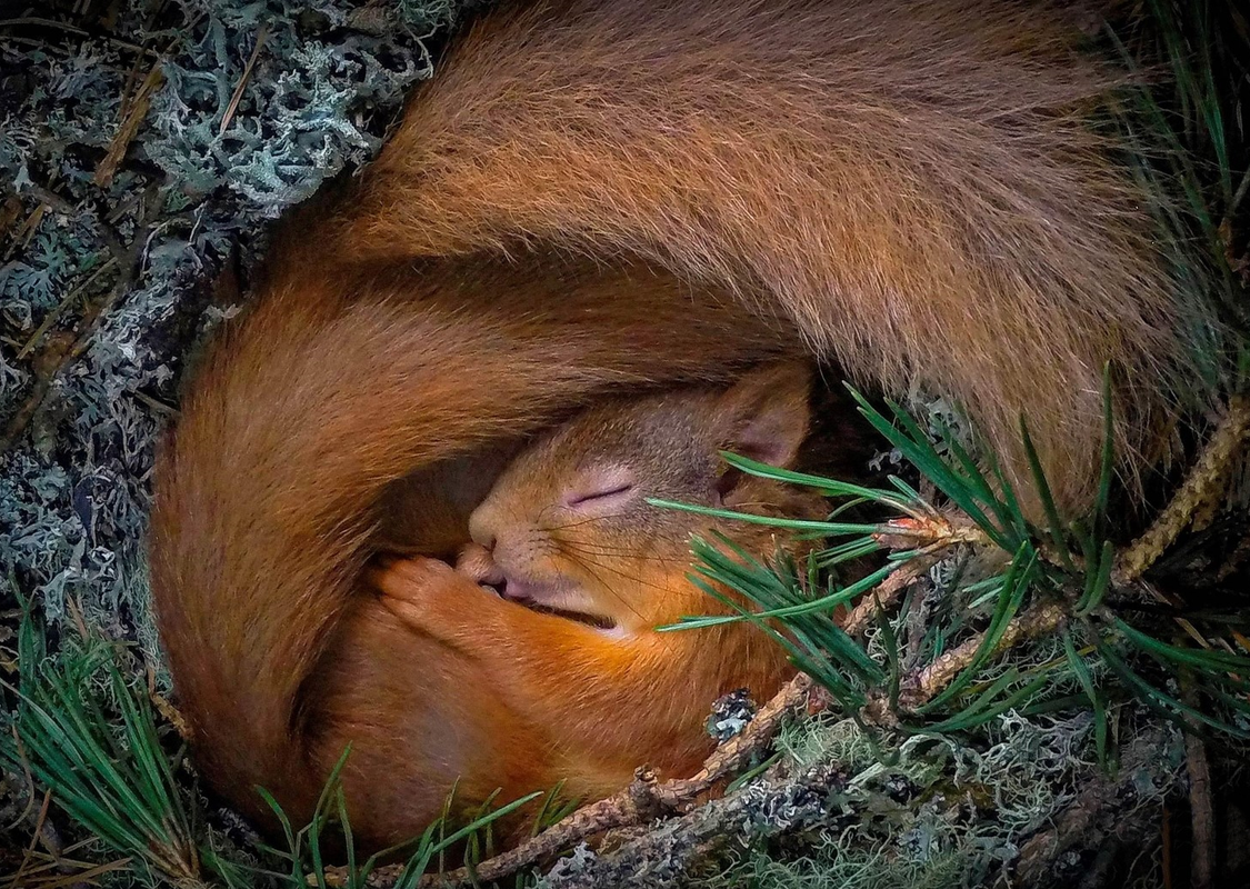 Red Squirrel in a nest of pine needles and lichen