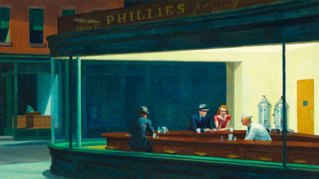 This is a picture of an art installation which is really accurate as to the characters in “Nighthawks” (there are better pictures of it, but this is the first one I found that was not blocked from being linked) .