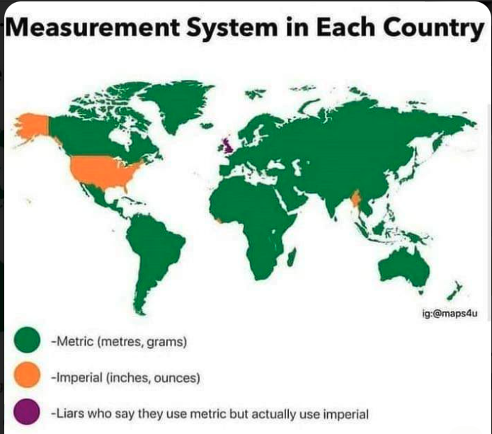 And Canada is sort of half metric, half imperial, with a healthy dose of US standard cos of US packages and such, though we’ve have metric printed alongside avoirdupois for years.