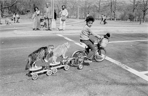 Taking the cats for a ride, Central Park, New York City, 20th March, 1976.