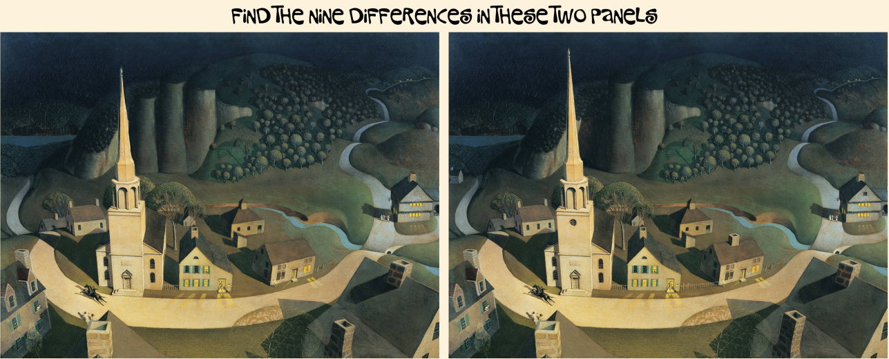 It’s already midnight, and he finds himself riding through two ever-so-slightly different landscapes, in Grant Woods’ 1931 painting…. as filtered through Cleo and Company.