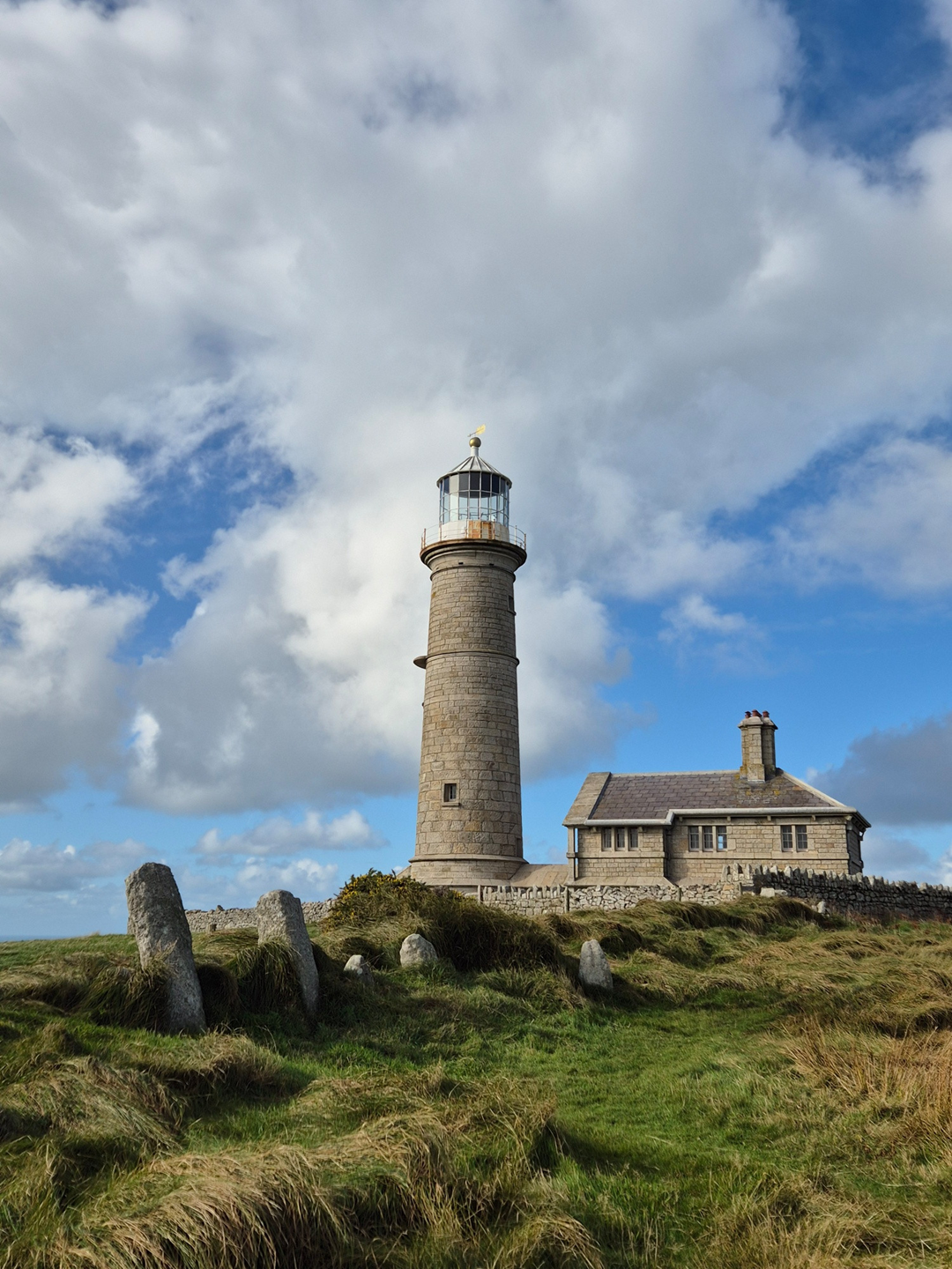 The Celtic gravestones in the old cemetery on Lundy, with the Old Light behind, Lundy is located in the Bristol Channel.