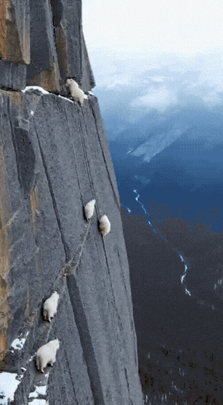 If they do, it’s not from a misstep, or losing their balance, it’s from a rock fall or avalanche underfoot, or sometimes from fighting each other in mating season, or fighting off a rare predator.