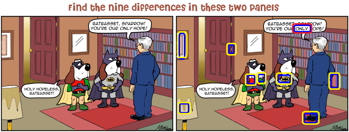 I found a mere six, one of which is NOT among Susan’s nine. Missed two easy ones – pathetic – and still can’t see one that Susan has marked. Plus, Susan has one very subtle diff that I can easily forgive myself for not spotting.