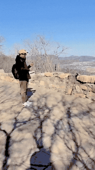 Why is he kicking off his shoe when he still has to walk on rocky terrain… maybe for miles, unless this is the edge of the parking lot at a touristy overlook.
