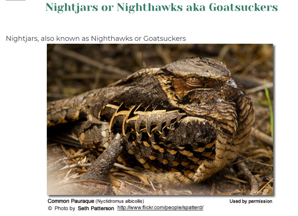 When I did my ornithology the group (Caprimulgiformes) rejoiced in the name “Goatsuckers and Oilbirds.” Today they also include nightjars, nighthawks, potoos, frogmouths, and owlet-frogmouths. (Had to look that last bit up.)