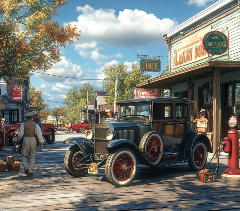The guy walking away on the left, and the building on the right (Excluding the writing on the signs) and the buildings in the distance are good, and form a good scene, but the cars and the fuel pump are waaaaaay off.