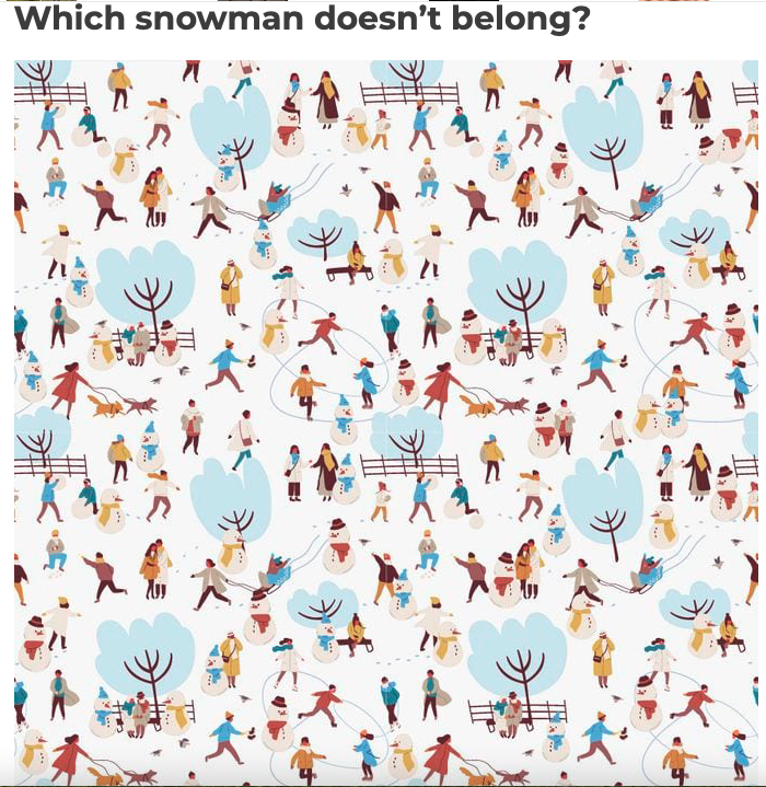 And there’s another snowman just above the lower right corner, similar to the others in yellow scarves, who has only two buttons, instead of three.