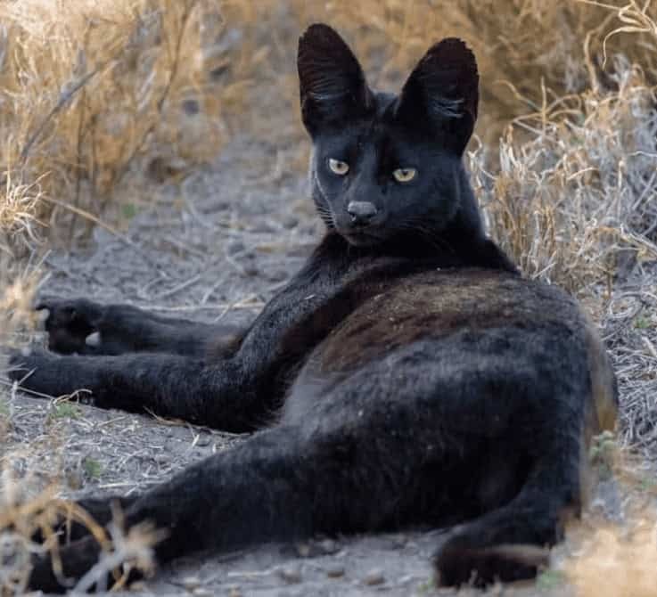Servals have golden tan coats with black spots, but they’re much smaller than leopards, and when they’re black, they’re just called black servals.