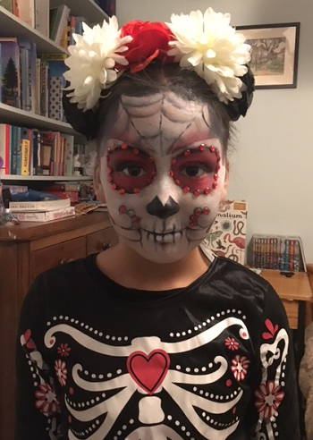 Her father, an art teacher, paints her up every Halloween in Day of the Dead make-up….