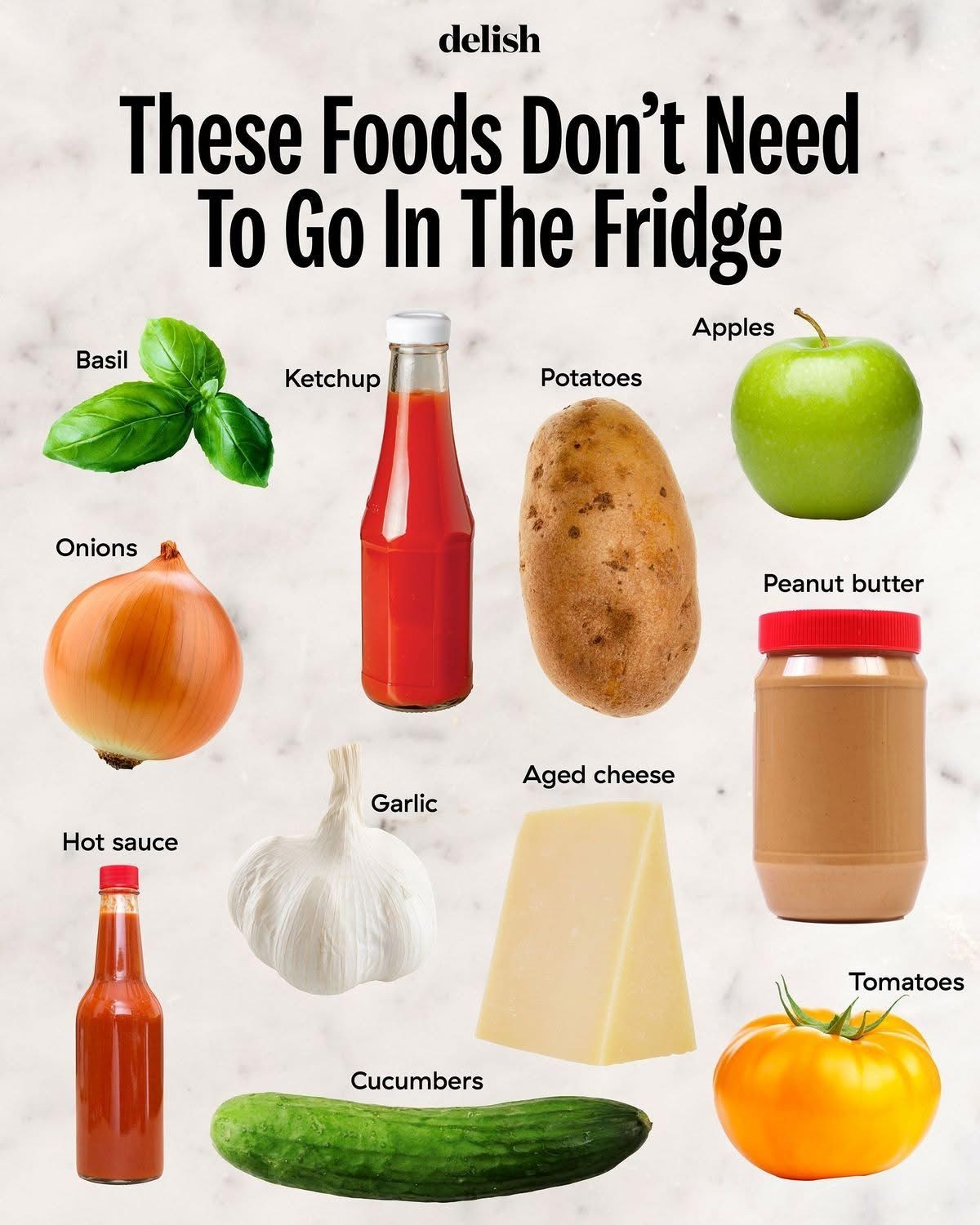Most places agree that potatoes, garlic and onions do worse in the fridge… tomatoes really lose their flavor when chilled. Sometimes bell peppers and apples lose some too, especially if you picked them, or bought them at the farmer’s market.