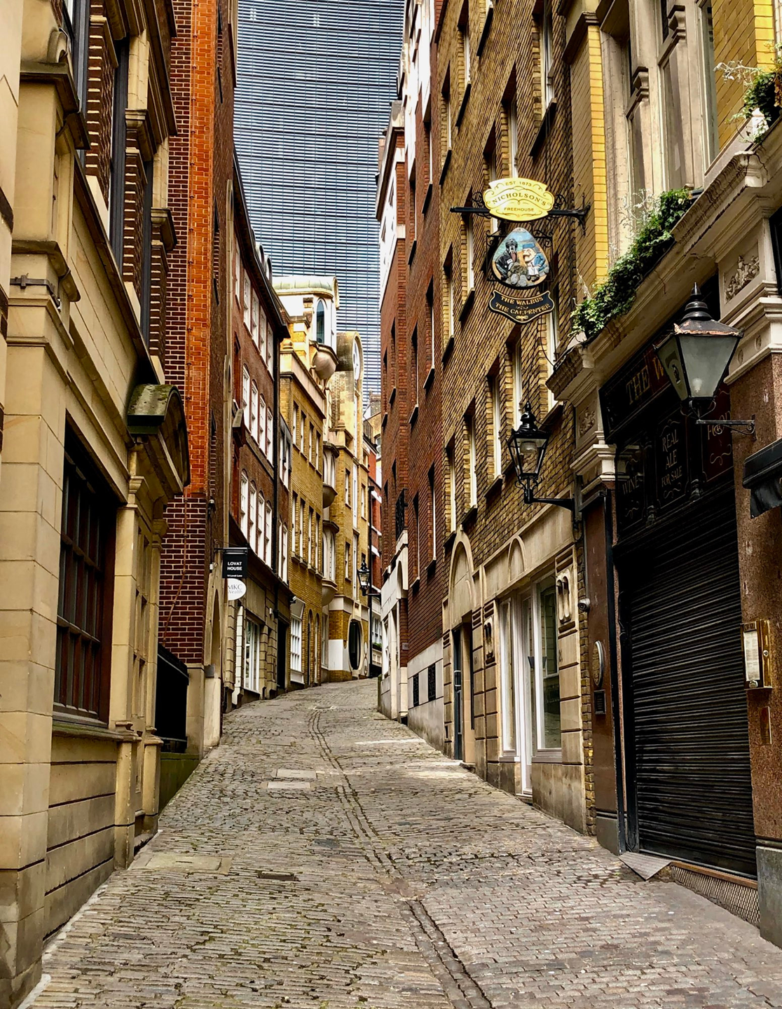 Across the centuries, A cobbled alley in London with a skyscraper backdrop.