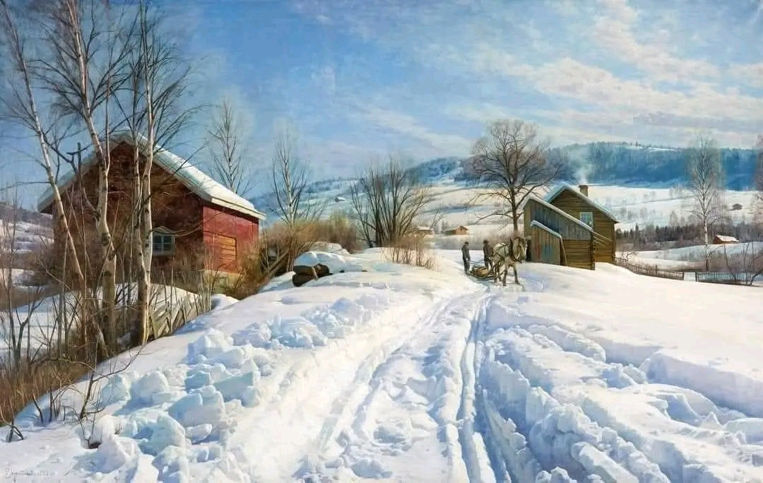 Artist Peder Mørk Mønsted (Danish, 1859-1941) ‘Mountain landscape on a sunny winter day’ (1923) Oil on canvas (128.0 x 201.0 cm).