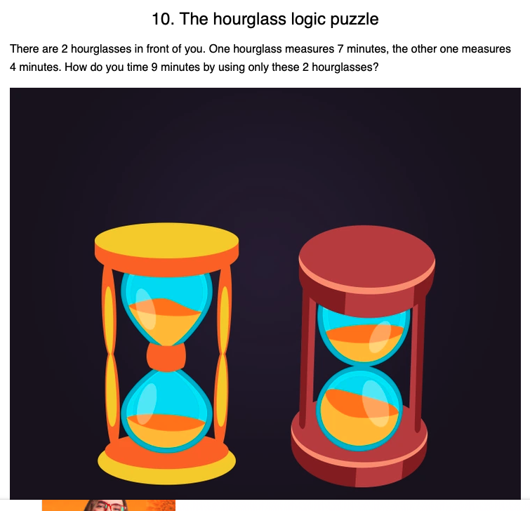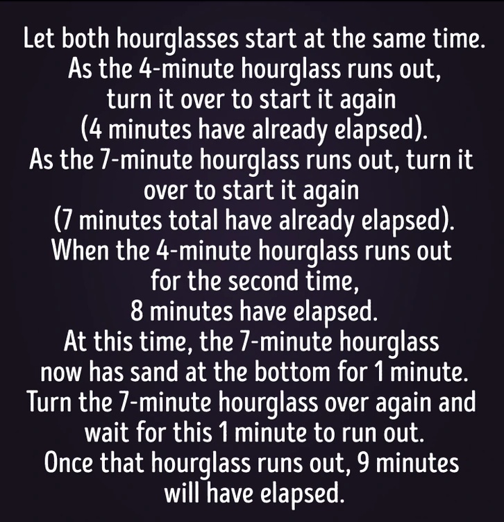 Start both hourglasses at the same time, when the 4min one runs out there is still three minutes to go in the 7min one. Turn the 4min one back over, and when the 7min one runs out there is one minute left in the 4min one.