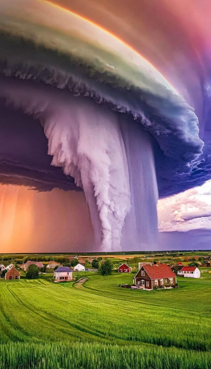 Houses are sitting on lush green grass… on the right it looks like a farm, but there are no paths to the house or buildings, no animals, fences, or fields of crops.