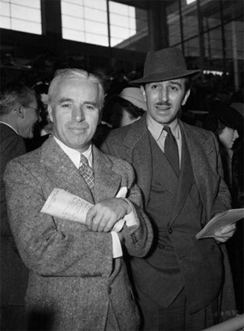 Charlie Chaplin, and animation pioneer Walt Disney, captured in a rare moment at the races in Arcadia, California – Original picture.