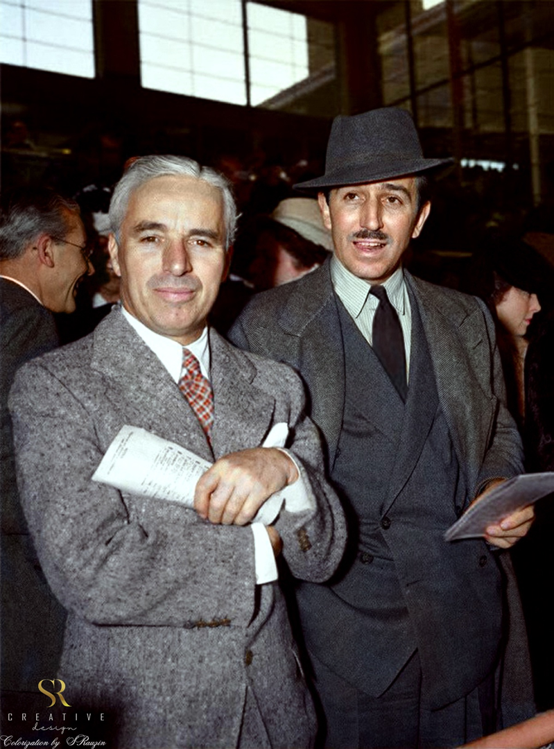 Charlie Chaplin, and animation pioneer Walt Disney, captured in a rare moment at the races in Arcadia, California – Colour by Sergey V. Rauzin, 2025.