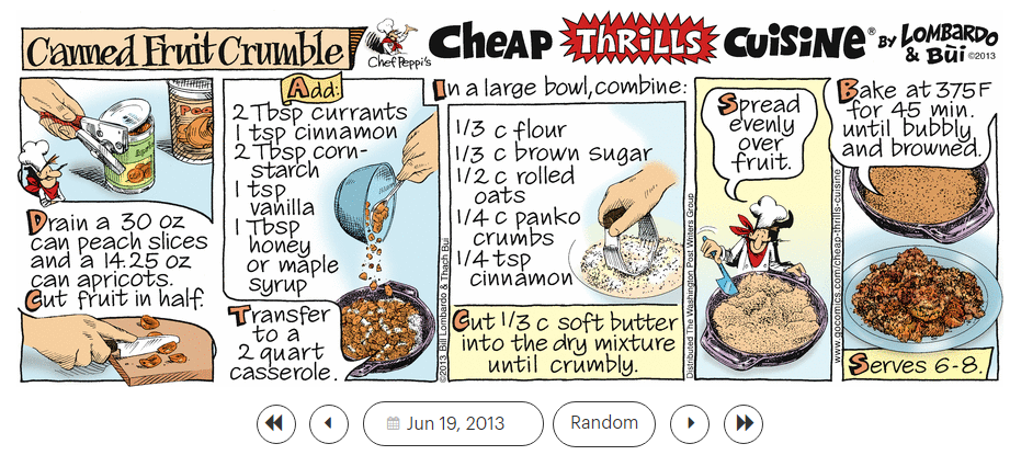 1. ‘Walk On The Wild Side,’ 2. ‘Walk This Way,’ 3. ‘Walkin’ On the Sun,’ and 4. ‘Walking On Sunshine,’ and the ‘Cheap Thrills Cuisine’ recipe 5. ‘Canned Fruit Crumble.’