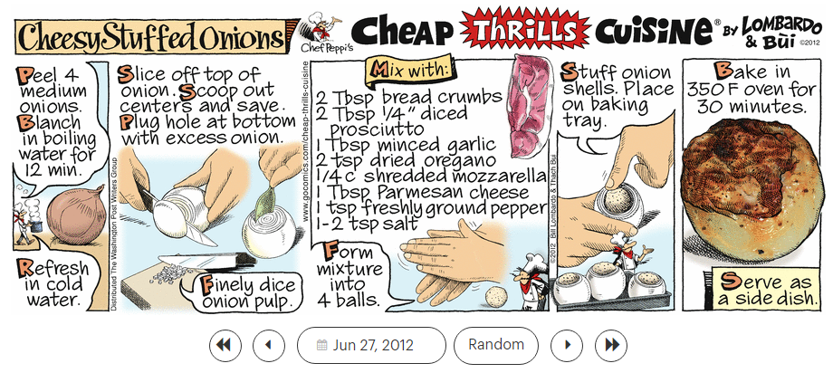 1. ‘Witch Doctor,’ 2. ‘Won’t Get Fooled Again,’ 3. ‘Woodstock,’ and 4. ‘Wooly Bully,’ and the ‘Cheap Thrills Cuisine’ recipe 5. ‘Cheesy Stuffed Onions.’