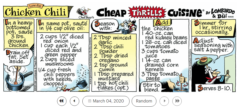 1. ‘Your Mama Don’t Dance,’ 2. ‘Your Wildest Dreams,’ 3. ‘You’re The One That I Want,’ and 4. ‘Yummy Yummy Yummy,’ and the ‘Cheap Thrills Cuisine’ recipe 5. ‘Chicken Chili (low fat).’