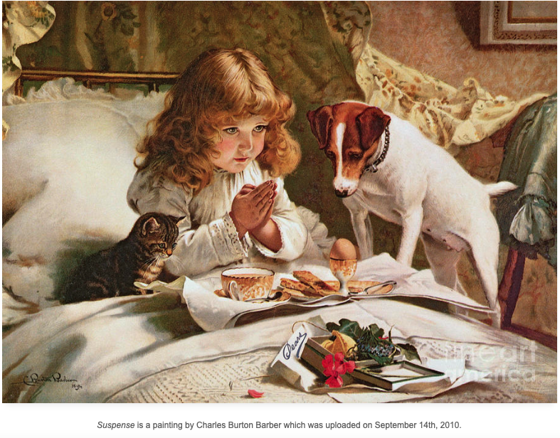 She’s saying her prayers with her eyes open…’cause she knows the terrier will have her breakfast in a flash if she closes them.