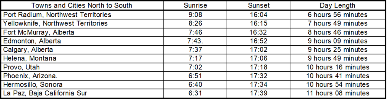 Just for fun, I put together a table to demonstrate the effect of the curvature of the Earth and its 23º tilt on sunrise and sunset times for today.