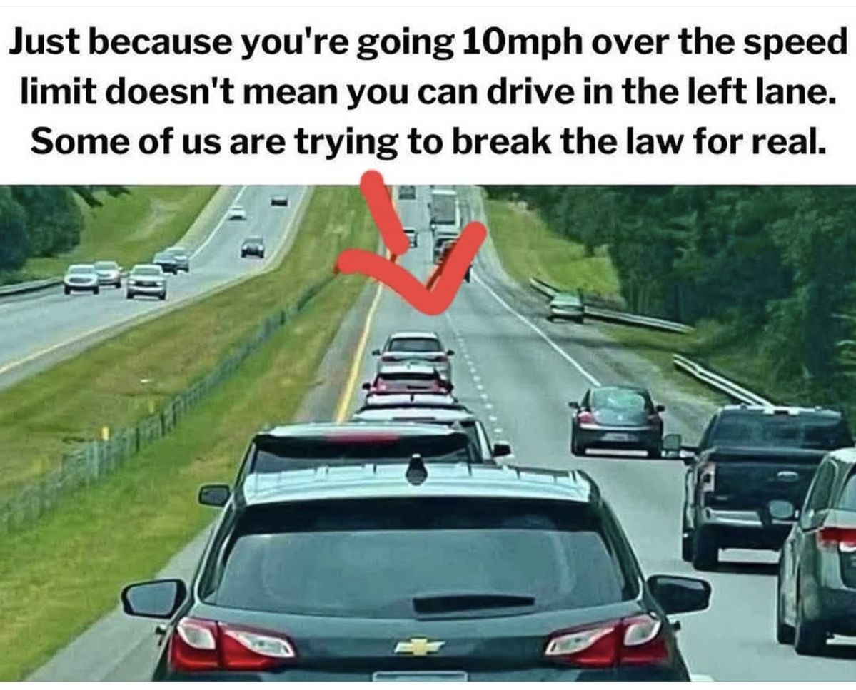 So true. There is a four-lane highway through my town with a 55 m.p.h. speed limit. I can drive on it at 70 m.p.h. and have to remain in the right hand lane.
