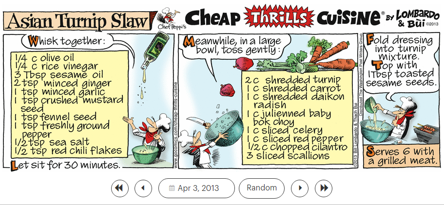 ‘ Jealous Guy,’ ‘Johnny B. Good,’ ‘Just A Gigolo / I Ain’t Got Nobody,’ and ‘Karma Chamelion,’ and the ‘Cheap Thrills Cuisine’ recipe ‘Asian Turnip Slaw’.