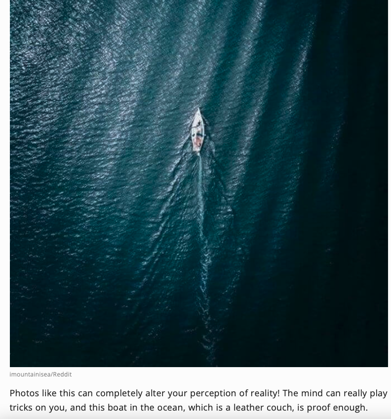 Or is it actually a tiny model boat someone purposely posed on the “waves”? The caption doesn’t say it’s not.