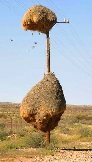 Other sites said that the weavers traditionally nested in trees but big trees are rare, so they’ve adapted to telephone poles. The nests are so big, other species also move in and share the space.