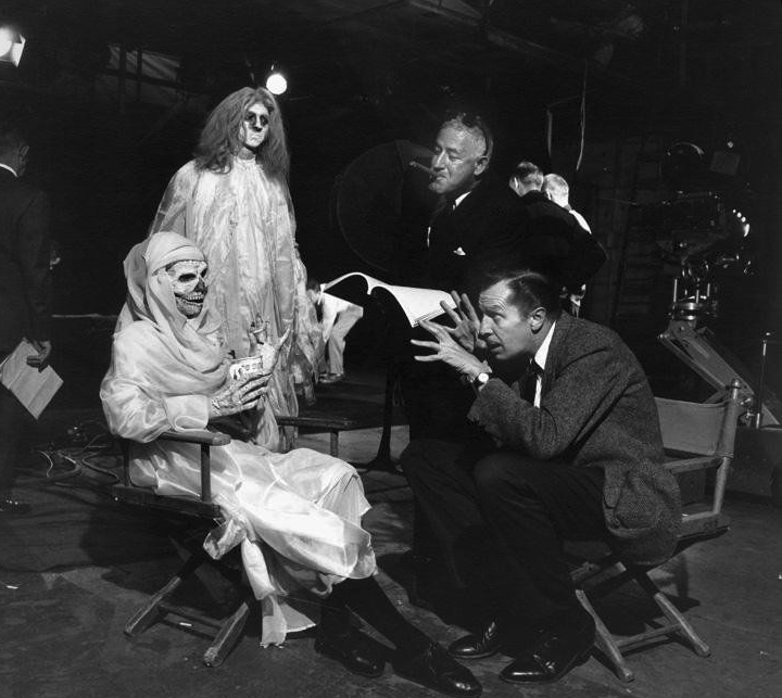 Price is visiting the set of “13 Ghosts”, directed by William Castle, the fellow with the cigar, in 1960.