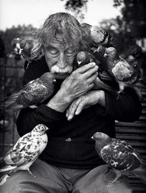According to comments in a couple of places, the subject is a fellow named Guisseppe, who used to sit outside Notre Dame, in Paris, surrounded by dozens of pigeons.