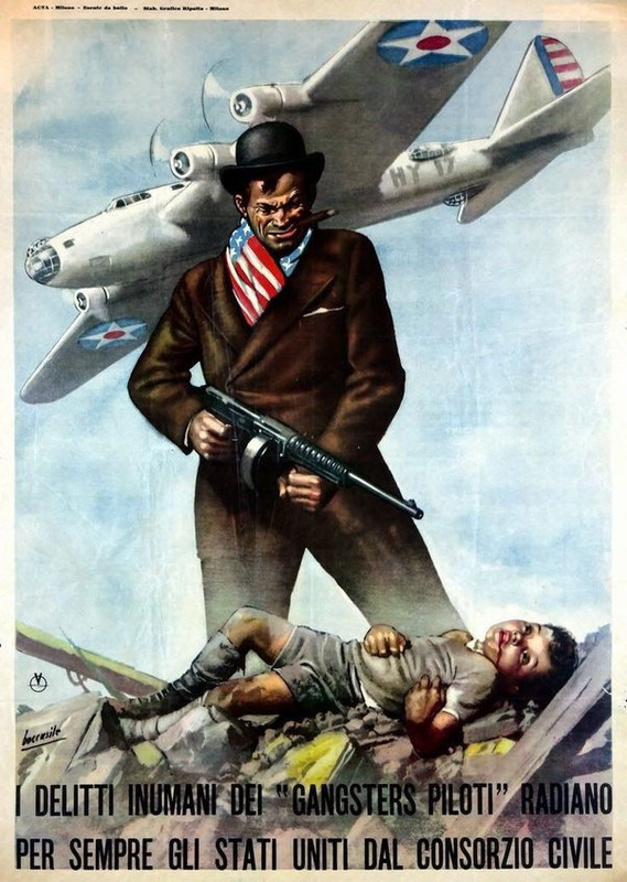 On another site, it was suggested that the strange attire and swarthy features of the supposed American pilot were chosen to remind Italians of the Sicilian mafia, which they would recognize.