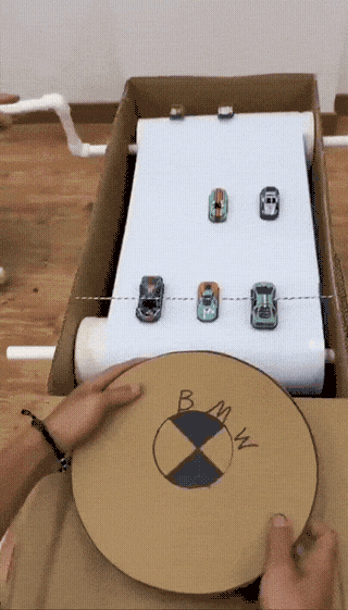 On the one above, it looks like those are actual toy cars. They don’t seem to be glued in place, cos some shift to the side… so how do they stay on and come back up?